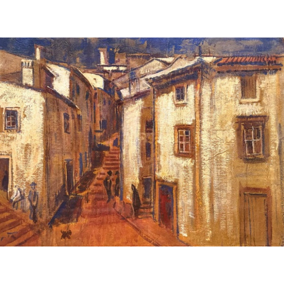 SÉRGIO TELLES "Fachada Judiaria, Castelo de Vide - Portugal" têmpera sobre tela, medindo 57 X 77 cm, assinado no canto inferior esquerdo, representando a cidade de Castelo de Vide, Portugal, 1977