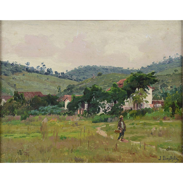 Baptista da Costa - Paisagem com figura e casario - Óleo s/ madeira Ass. inf. direito. 19 x 24 cm. Obra reproduzida no Catálogo da Bolsa de Artes Maio/2019.