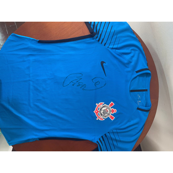 Camisa de goleiro do Corinthians e par de luvas oficiais, contendo as iniciais de sua esposa e filha, assinadas pelo goleiro Cássio após seu 700º jogo pelo clube.