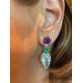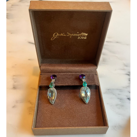 Brinco ouro branco 18k da designer de joias Julia Meirelles, com 2 gotas água marinha de 14,94cts, 2 gotas esmeralda de 1,22 cts, 2 ametistas redondas Pau d’Arco de 3,67 cts e Diamantes total de 0,38 cts.