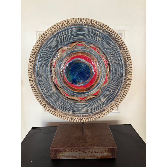 Uma peça bela de cerâmica bem postada em base robusta de metal, com cores cintilantes em um trabalho cuidadoso de formas e camadas, rico em pequenos detalhes, entitulado de "Mandala II" pela artista e se assemelhando também a um olho protetor, difusor de boas energias e fluidos.