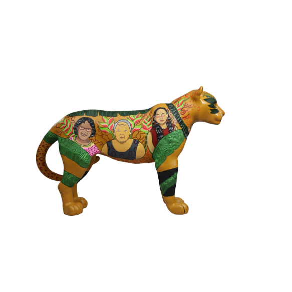 Inspiração do projeto: Traz a força da ancestralidade das mulheres da Amazônia, unindo memórias pessoais e a conexão com a floresta. A escultura reflete a imponência da onça-pintada, celebrando a relação entre arte, natureza e força feminina.