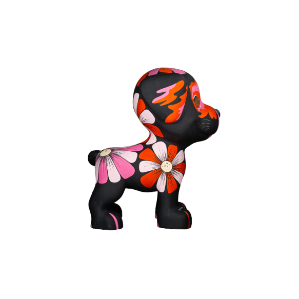 Inspiração do projeto: Sua obra “Adote um Amor” foi inspirada em sua cachorrinha, resgatada das ruas e companheira de muitos anos. O fundo preto da escultura representa a cor da pelagem do animal, e os detalhes coloridos expressam a alegria, a energia e o amor que ela trouxe para a vida da artista. O nome da obra reflete a crença de que o amor não se compra, ele se encontra, especialmente através da adoção.