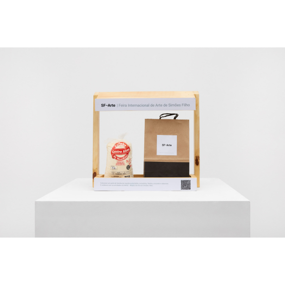 Augusto Leal - SF-Arte - Feira Internacional de Arte de Simões Filho - 2025 - Farinha de mandioca da Bahia, sacola de papel, madeira e adesivo. Ed. 1-50 - 40x44x16cm - Assinado
