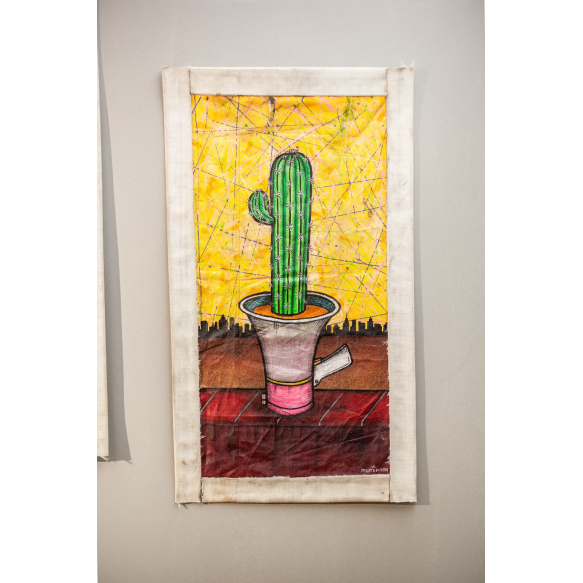 Em San Pedro (Trichocereus pachanoi), eu articulei elementos centrais da minha pesquisa artística para refletir sobre a resistência socioambiental e o poder da fala. A obra integra uma série de três pinturas em que diferentes espécies de cactos emergem de megafones, estabelecendo uma conexão direta entre o instrumento de denúncia e a força vital da flora. Enquanto o megafone atua como um símbolo de amplificação das vozes que reivindicam direitos, o cacto introduz a urgência da questão hídrica e a resiliência intrínseca tanto à natureza quanto às populações que dela fazem parte. A materialidade da peça reforça essa mensagem, utilizando lama do Rio Doce e uma moldura de mangueira de incêndio para situar a obra no campo da urgência e da persistência, reafirmando que a vida e a resistência florescem mesmo em territórios de escassez. (Mundano)
