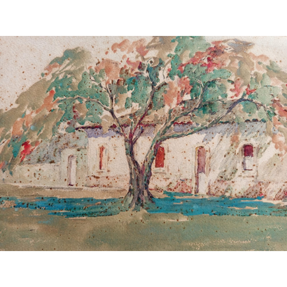 Campão, Aquarela sobre cartão, Arvore com Casa, medindo 37cm x 47cm, Assinado no canto inferior esquerdo. sem moldura