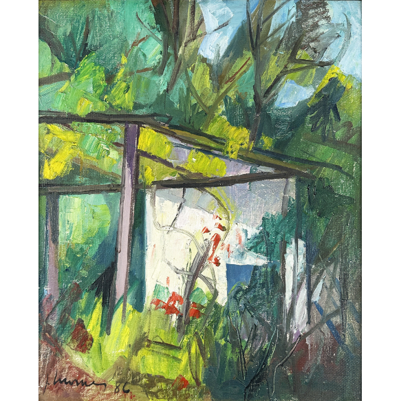 José Moraes - A casa do Caseiro, 1986 - Óleo sobre tela, colada sobre placa, assinado e datado, inferior esquerdo; assinado, datado, titulado e situado Embú no verso. - 44 x 36 cm.