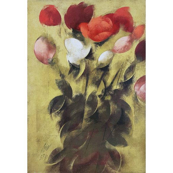 Carlos Scliar - Rosas, 1990 - Vinil e colagem encerrados sobre tela, assinado e datado inferior esquerdo; assinado, datado, titulado e situado Cabo Frio no verso.- 56 x 37 cm.