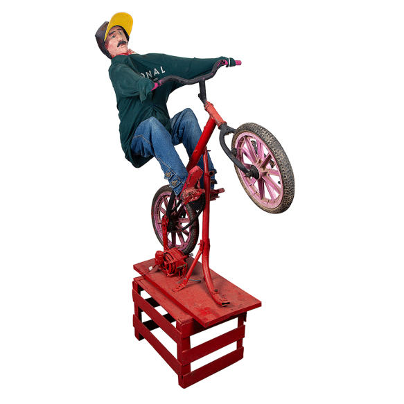 JU CABELEIRO - Homem andando de bicicleta - Técnica Mista (Motor, Ferro, Tecido, Plástico, Metal, Borracha, Caixa de Madeira e Gesso Pintado - 160 x 130 x 38 cm.