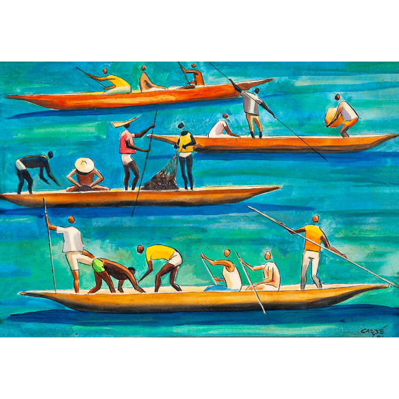 CARYBÉ - Canoeiros -Vinil Sobre Papel Colado Eucatex - Ass.dat.1986inf.dir,Ass.tit.dat. no verso - 35 x 50 cm.Procedência Ponto da Artes - Salvador - BA.