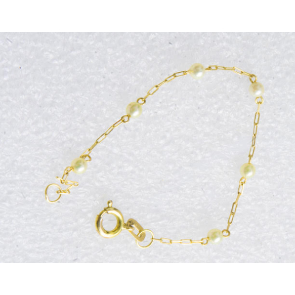 PULSEIRA INFANTIL EM OURO AMARELO 18K 720 E FECHO EM OURO 5K CONTRASTADOS COM PÉROLAS.PESO 0,8 GRAMAS MEDINDO 12CM ABERTA.
