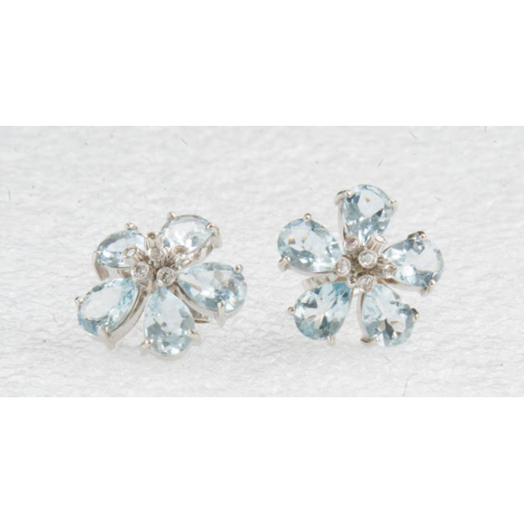 PAR DE BRINCOS EM OURO BRANCO 18K CONTRASTADO COM DEZ GOTAS DE ÁGUAS MARINHAS COM APROX 6 QUILATES TOTAL E DOZE BRILHANTES DE APROX 0,12 PONTOS TOTAL.PESO 6,6 GRAMAS MEDINDO 1,5CM DE DIÂMETRO.