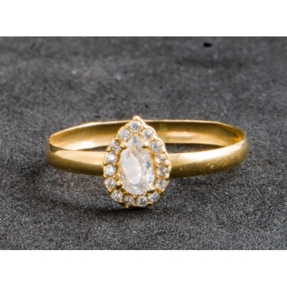ANEL SOLITÁRIO EM OURO AMARELO 18K COM UM DIAMANTE EM GOTA DE APROX 0,15 PONTOS + 15 BRILHANTES FULL CUT DE APROX 0,08(OITO) PONTOS TOTAL.PESO 0,8 GRAMAS ARO 16,5.Sinais de uso no ro.