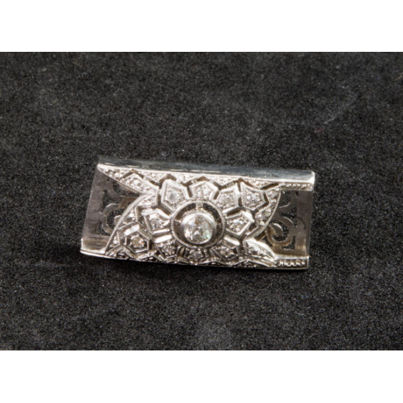 PARTE DE UM FECHO EM PLATINA COM UM DIAMANTE OLD EUROPEAN CUT DE APROX 0,14 PONTOS + DEZ BRILHANTES 8X8 DE APROX 0,20 PONTOS TOTAL.PESO 7,2 GRAMAS MEDINDO 2,6CM X 1,1CM X 0,8CM.
