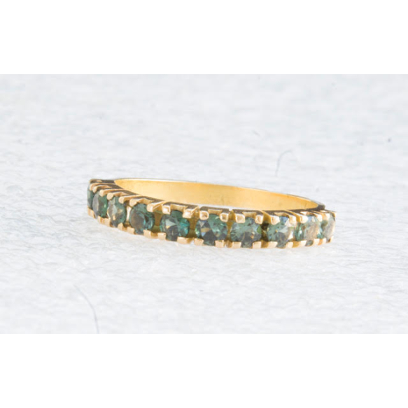MEIA ALIANÇA EM OURO AMARELO 18K COM DEZ PEDRAS VERDES.PESO 2,1 GRAMAS ARO 15,5.