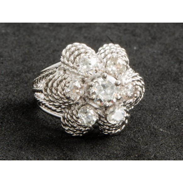 BELÍSSIMO ANEL FRANCÊS EM PLATINA CIRCA 1950 CONTRASTE MAITRE JOAILLIER E CONTRASTE FRANCÊS.COM APROX 1,81 QUILATES TOTAL DE DIAMANTES(DIAMANTE OLD EUROPEAN CUT CENTRAL DE APROX 0,71 PONTOS + SEIS DIAMANTES DE APROX 1,10 QUILATES TOTAL COR "G H I "PUREZA "VS " ).PESO 8,1 GRAMAS ARO 11,5.BASE MEDE 1,7CM DE DIÂMETRO.Assista ao vídeo.