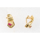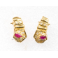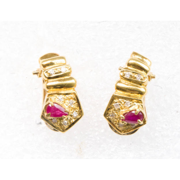 PAR DE BRINCOS EM OURO AMARELO 18K CONTRASTADO COM DUAS PEDRAS VERMELHAS E 14 BRILHANTES 8X8 DE APROX 0,14 PONTOS TOTAL.PESO 5,9 GRAMAS.MEDINDO 2CM X 1CM.FECHO DE PINO COM CLIP.