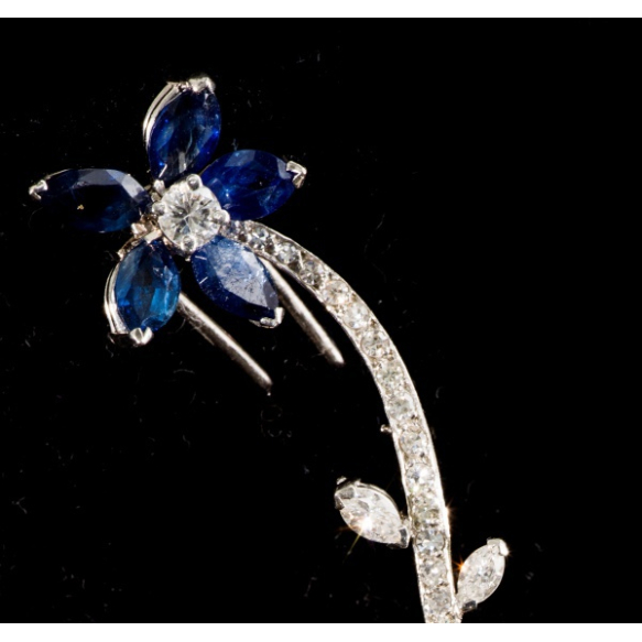 BROCHE ATEMPORAL EM PLATINA ANOS 60 .CLIP FORMATO DE FLOR COM CINCO SAFIRAS AZUIS ORIENTAIS + APROX 0,80 PONTOS TOTAL DE DIAMANTES(UM BRILHANTE FULL CUT CENTRAL DE APROX 0,15 PONTOS+ 26 BRILHANTES 8X8 DE APROX 0,50 PONTOS TOTAL + DOIS DIAMANTES NAVETES DE APROX 0,15 PONTOS TOTAL).PESO 5,8 GRAMAS MEDINDO 6CM DE COMPRIMENTO.