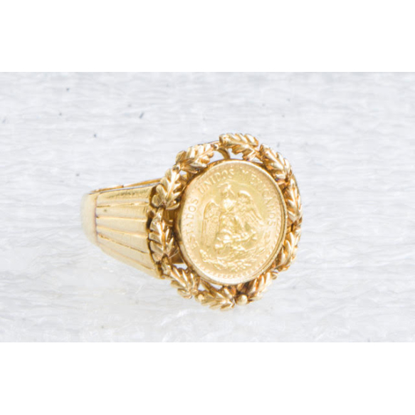 ANEL COM BRASÃO EM OURO ACIMA DE 18K COM MOEDA MEXICANA NO CENTRO.EM OURO 18K.PESO 13,5 GRAMAS ARO 12,5.BASE MEDE 1,9CM DE DIÂMETRO.ARO ESTÁ ABERTO EMBAIXO.