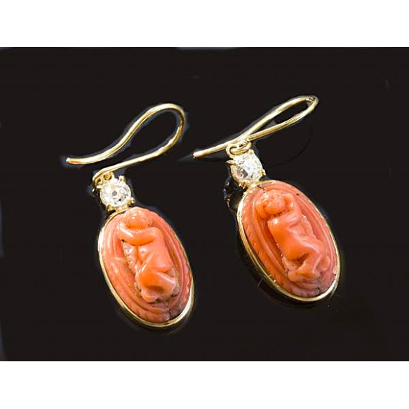 PAR DE BRINCOS EM OURO 18K COM DOIS RAROS CAMAFEUS SEC XVIII EM CORAIS LARANJA REPRESENTANDO QUERUBINS COM DOIS DIAMANTES CUSHION CUT DE APROX 0,80 PONTOS TOTAL COR "UM DELES " J " PUREZA "SI2 "E O OUTRO "OP" "VS " . PESO 6,5 GRAMAS MEDINDO 2,5 X 1,2CM.AMBOS APRESENTAM UMA PEQUENINA FALHA.