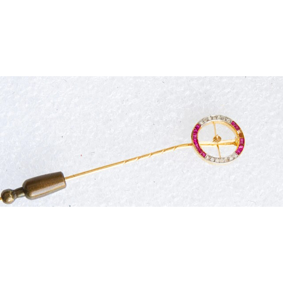 REFINADO ALFINETE DE GRAVATA ART DÉCO EM OURO 18K E PLATINA COM 14 DIAMANTES ROSE CUT E DOZE RUBIS.PESO 1,9 GRAMAS SEM CONTAR O FECHO EM METAL.MEDINDO 1,3CM DE DIÂMETRO X 6,8CM DE COMPRIMENTO.FALTAM ALGUNS RUBIS.