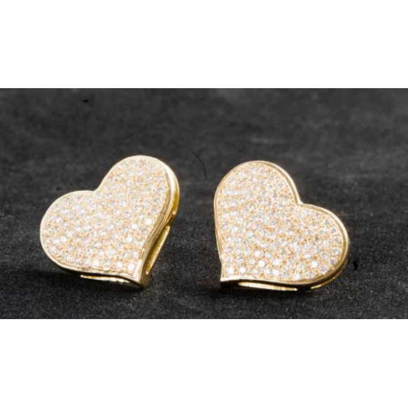 PAR DE BRINCOS CORAÇÕES EM OURO AMARELO 18K COM APROX 200 BRILHANTES FULL CUT DE APROX 3 QUILATES TOTAL.PESO 9,5 GRAMAS MEDINDO 2,22CM X 1,7CM X 0,3CM.