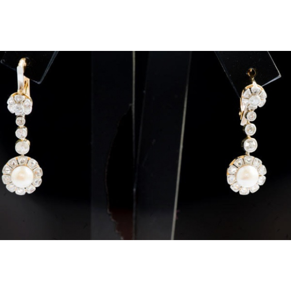 PAR DE BRINCOS CIRCA 1910 EM OURO AMARELO 18K ,PÉROLAS E 40 DIAMANTES ANTIGOS ENGARCE MILLE GRAIN DE APROX 1,20 QUILATES TOTAL. PESO 4,4 GRAMAS MEDINDO 2,5CM DE COMPRIMENTO.