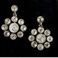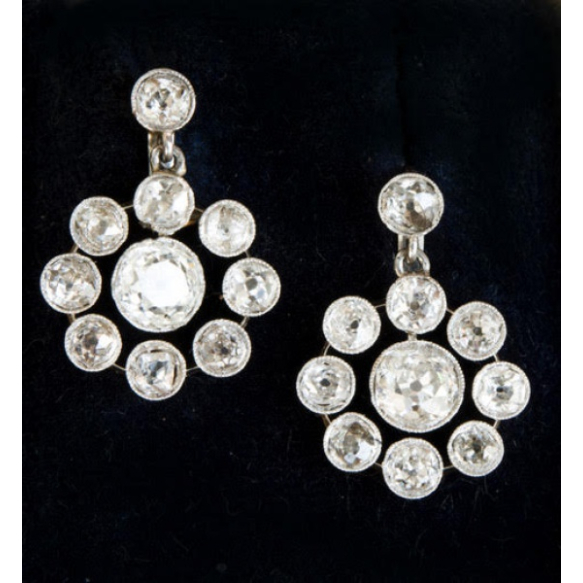 BELÍSSIMO PAR DE BRINCOS CIRCA 1920 ENGARCE MILLE GRAIN. EM OURO 18K E PLATINA COM DOIS DIAMANTES CENTRAIS DE APROX 1,90 QUILATES TOTAL +DOIS DIAMANTES DE APROX 0,50 PONTOS TOTAL + 16 DIAMANTES DE APROX 2,72 QUILATES TOTAL.PESO 6,3 GRAMAS MEDINDO 2 X 1,5CM