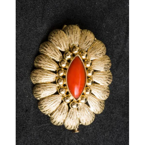 GRAND BROCHE PINGENTE COM CORAL MEDITERRÂNEO EM OURO AMARELO 18K.PESO 10,6 GRAMAS MEDINDO 3,7CM X 3,2CM.