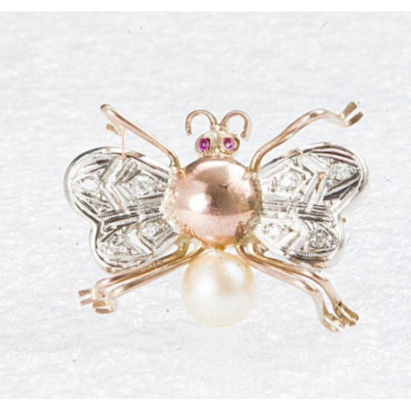 BROCHE ABELHA ANOS 50 EM OURO 18K,PLATINA,PÉROLA,QUATRO DIAMANTES ROSE CUT.PESO 4,2 GRAMAS MEDINDO 2,5CM X 1,4CM.