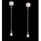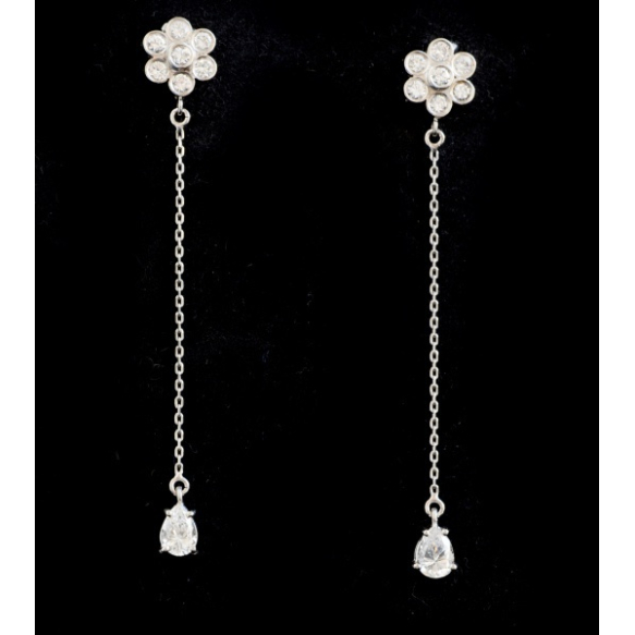 PAR DE BRINCOS LONGOS EM OURO BRANCO 18K CONTRASTADO COM APROX 1,30 QUILATES TOTAL DE DIAMANTES DE ÓTIMA COR (DOIS DIAMANTES EM GOTA DE APROX 0,75 PONTOS TOTAL DE ÓTIMA COR " F G " PUREZA " VS "+ 14 BRILHANTES FULL CUT DE APROX 0,56 PONTOS TOTAL).PESO 5,3 GRAMAS MEDINDO 6CM DE COMPRIMENTO.
