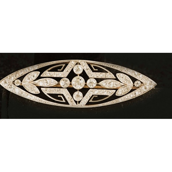 REFINADO BROCHE ART DÉCO DE GRANDE QUALIDADE REALIZADO NOS ESTADOS UNIDOS EM OURO 14K E PLATINA COM APROX 5 QUILATES TOTAL DE DIAMANTES (CINCO DIAMANTES CUSHION CUT MAIORES + 74 DIAMANTES MENORES TOTALIZANDO APROX 2,50 QUILATES.)PESO 8.1 GRAMAS MEDINDO 5,5 X 1,8CM NA PARTE MAIS LARGA.