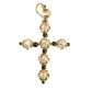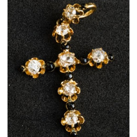 PINGENTE CRUZ CIRCA 1850 EM OURO 14K COM SETE DIAMANTES CUSHION CUT DE APROX 1,20 QUILATES TOTAL E DETALHES EM ESMALTE PRETO.PESO 3,2 GRAMAS MEDINDO 4CM X 2,5CM.