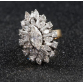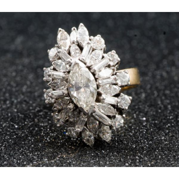 FABULOSO ANEL EM OURO 18K E PLATINA COM APROX 3,56 QUILATES TOTAL DE DIAMANTES(UM DIAMANTE NAVETE CENTRAL 0,90 PONTOS COR "I 'PUREZA " SI2" + DEZ DIAMANTES BAGUETES DE APROX 0,90 PONTOS TOTAL + 14 DIAMANTES NAVETES DE APROX 1,26 QUILATES TOTAL +DEZ BRILHANTES FULL CUT DE APROX 0,50 PONTOS TOTAL COR APROX "F G ".)PESO 13,6 GRAMAS ARO 16 .BASE MEDE 2,5CM X 1,8CM.