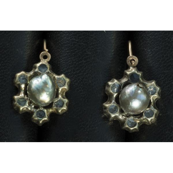 RARIDADE.JÓIA DE APROX 300 A 400 ANOS. PAR DE BRINCOS DA ÉPOCA DE LA CONQUISTA ENTRE 1600 E 1700. EM PRATA E OURO 14K COM DUAS PÉROLAS NEGRAS NATURAIS DE ÁGUA SALGADA COMPROVADAS, e 12 DIAMANTES ROSE CUT. PESO 8.2 GRAMAS MEDINDO 1.5CM DE DIÂMETRO.