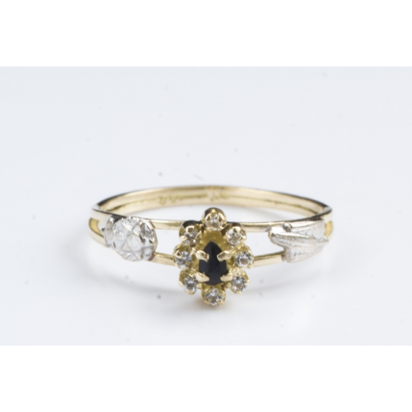DELICADO ANEL DE FORMATURA EM OURO AMARELO 18K CONTRASTADO COM UMA PEDRA AZUL E E OITO PEDRAS BRANCAS.PESO 1,6 GRAMAS ARO 12,5.