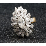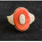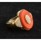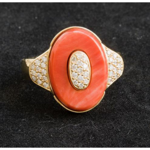 ANEL EM OURO AMARELO 18K COM CORAL LARANJA E 37 BRILHANTES FULL CUT DE APROX 0,55 PONTOS TOTAL.PESO 10,3 GRAMAS ARO 16.BASE MEDE 1,8 X 2,2CM.