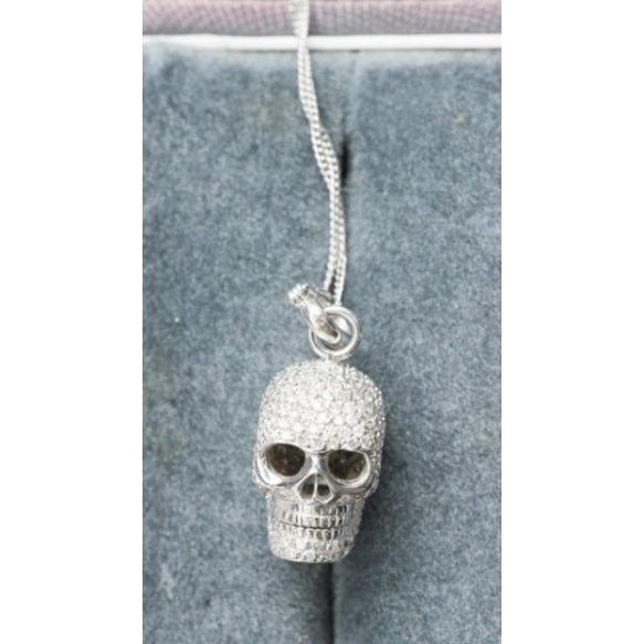 COLAR COM PINGENTE CAVEIRA EM OURO BRANCO 18K CONTRASTADO CRAVEJADA COM APROX 220 BRILHANTES FULL CUT DE ÓTIMA QUALIDADE APROX 2 QUILATES TOTAL. PESO 6,7 GRAMAS. COLAR MEDINDO 40,5M ABERTO E O PINGENTE 2,5CM DE COMPRIMENTO