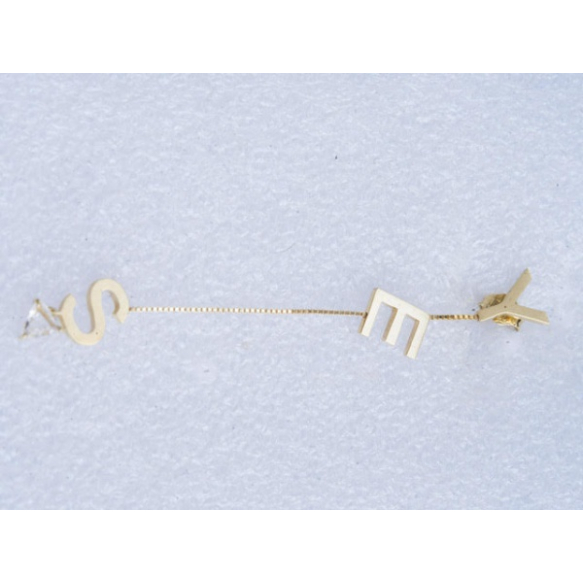 BRINCO DE UM LADO SÓ " YES" EM OURO AMARELO 18 CONTRASTADO E DETALHE EM CRISTAL.PESO 3 GRAMAS.MEDINDO 8,7CM DE COMPRIMENTO.