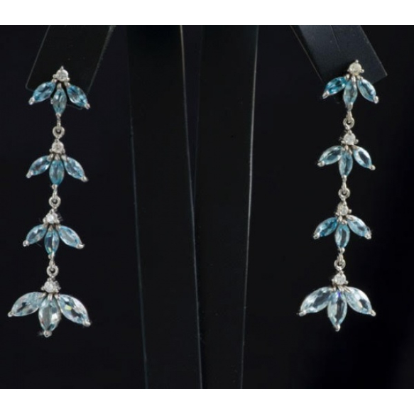 PAR DE BRINCOS LONGOS EM OURO BRANCO 18K CONTRASTADO COM 24 ÁGUAS MARINHAS E OITO BRILHANTES FULL CUT DE APROX 0,20 PONTOS TOTAL.PESO 6,4 GRAMAS MEDINDO 5CM DE COMPRIMENTO.