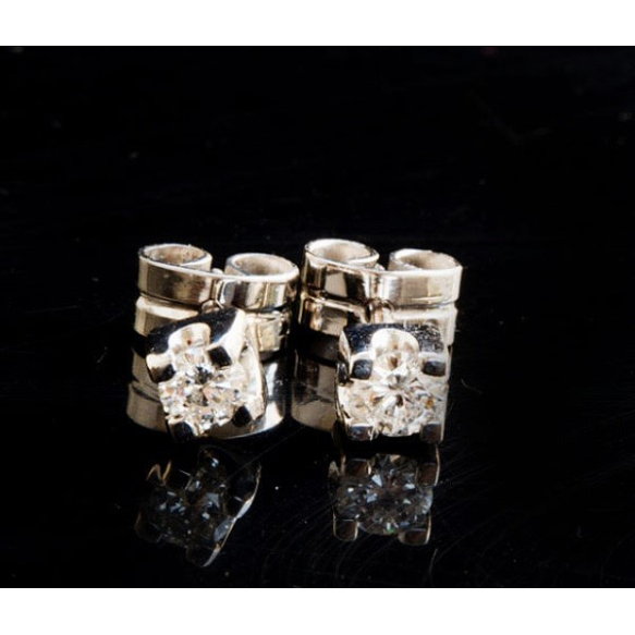 PAR DE BRINCOS SOLITÁRIOS COM CERTIFICADO GEMOLÓGICO EM OURO BRANCO 18K COM DOIS BRILHANTES MEDINDO " 0,19 " PONTOS CADA COR " G e H " MESMA PUREZA " VS1 ".PESO 1,6 GRAMAS.ACOMPANHA CERTIFICADO DA JÓIA PGRJZ0897.