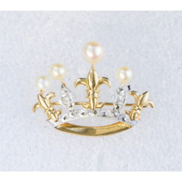 MIMOSO BROCHE CORÔA COM FLOR DE LIS EM OURO 18K,PLATINA ,DOIS BRILHANTES 8X8 E PÉROLAS DE 4,5MM e 5,9MM.PESO 4,8 GRAMAS MEDINDO 3CM X 2,5CM.