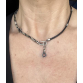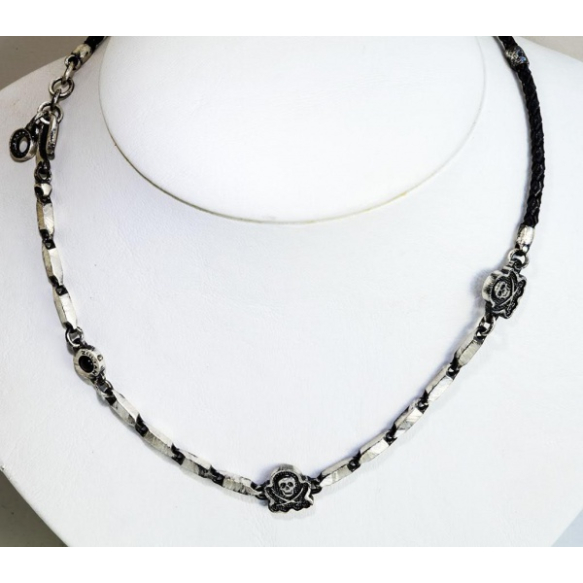 COLAR ASSINADO POR ARTISTA ITALIANO ROCK AND ROLL EM PRATA 925 CONTRASTADA COM EFEITO ENVELHECIDO, ESCOVADO COM CAVEIRAS E COURO PRETO.PESO 18 GRAMAS MEDINDO 42CM DE COMPRIMENTO ABERTO.