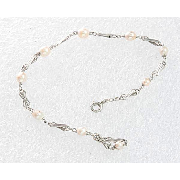 DELICADA PULSEIRA ART DÉCO EM PLATINA COM PÉROLAS.PESO 2,5 GRAMAS MEDINDO 17CM ABERTA.