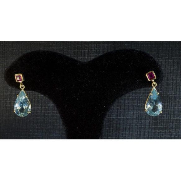 PAR DE BRINCOS EM OURO 14K COM DUAS GOTAS DE ÁGUAS MARINHAS DE COR INTENSA DE APROX 6.20 QUILATES TOTAL+ DUAS PEDRAS VERMELHAS.PESO 2.8 GRAMAS MEDINDO 2.2CM DE COMPRIMENTO