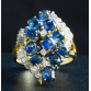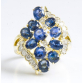 ANEL EM OURO AMARELO 18K 720 CONTRASTADO COM ONZE SAFIRAS AZUIS DE GRANDE QUALIDADE COM APROX 6 QUILATES TOTAL+ QUINZE BRILHANTES FULL CUT DE APROX TOTAL 0,44 PONTOS TOTAL+ CINCO DIAMANTES BAGUETES DE APROX 0,25 PONTOS TOTAL.PESO 8.9 GRAMAS ARO 23.BASE MEDE 2,8CM X 2,1CM