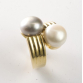 ASSINADO PEPE TORRAS.ANEL EM OURO AMARELO 18K CONTRASTADO COM DUAS PÉROLAS BUTTON,UMA CINZA E A OUTRA BRANCA.PESO 11 GRAMAS ARO 12,5.POSSUI UMA BATA INTERNA EM OURO PARA REGULAR