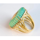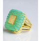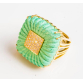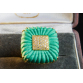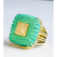 ASSINADO PEPE TORRAS.GRANDE ANEL EM OURO AMARELO 18K CONTRASTADO COM MATERIAL NA COR VERDE TURQUESA E 38 BRILHANTES FULL CUT DE APROX 0,57 PONTOS TOTAL.PESO 23,5 GRAMAS.ARO 16.BASE MEDE 2,3CM X 2,3CM X 0,7CM.POSSUI UMA BATA INTERNA PARA REGULAR O ARO.