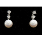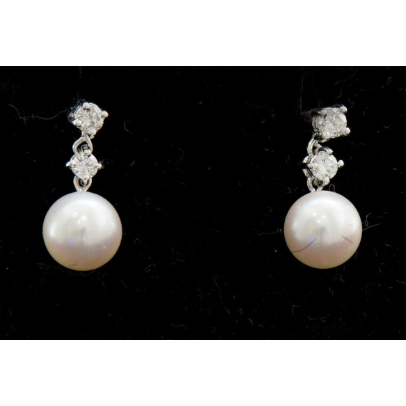 PAR DE BRINCOS EM OURO BRANCO 18K CONTRASTADO COM PÉROLAS DE 7MM E QUATRO BRILHANTES FULL CUT DE APROX 0,16 PONTOS TOTAL.PESO 4,1 GRAMAS MEDINDO 1,6CM DE COMPRIMENTO.