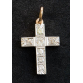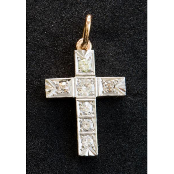 PINGENTE CRUZ CIRCA 1950 EM OURO 18K,PLATINA COM APROX 0,72 PONTOS TOTAL DE DIAMANTES( UM BRILHANTE FULL CUT MAIOR DE APROX 0,30 PONTOS + QUATRO BRILHANTES FULL CUT +DOIS DIAMANTES CUSHION CUT DE APROX 0,42 PONTOS TOTAL).PESO 7,6 GRAMAS MEDINDO 3,4CM X 2CM X O,3CM